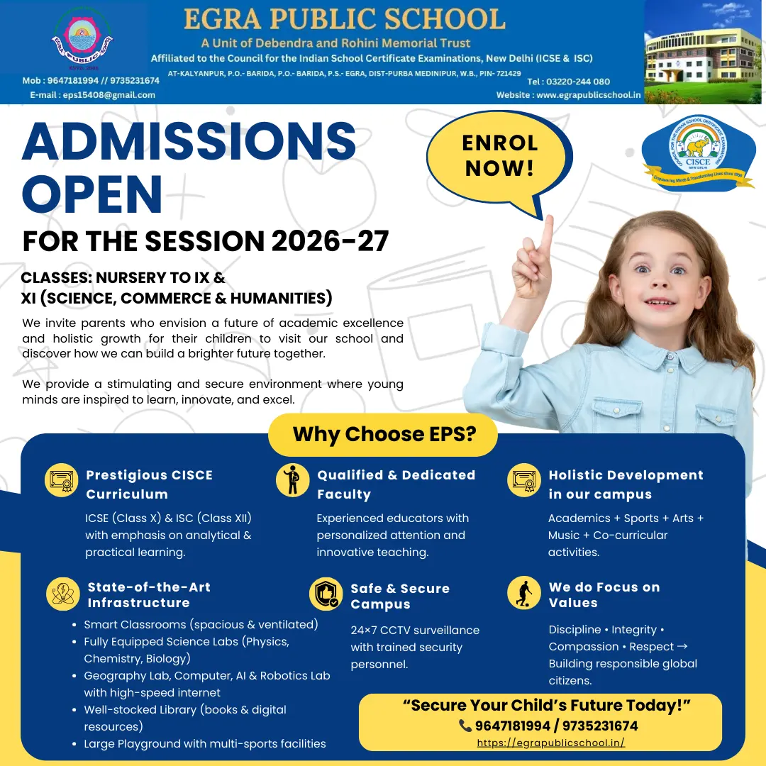EPS is a complete CO-educational institute, situated about 180km from heart (kolkata of the State at Egra, Purba Medinipur.